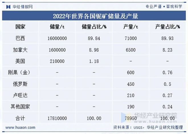 截至2022年底,全世界铌储量(以金属计算)超过1700万t,其中巴西储量1600万t,加拿大储量160万t;2022年全球铌矿产量7.8万t,其中巴西产量7.1万t,加拿大产量6500t,大型碱性碳酸岩型铌矿床是巴西与加拿大铌矿开采的重点对象,这两个国家对铌矿的市场拥有极大的控制权。