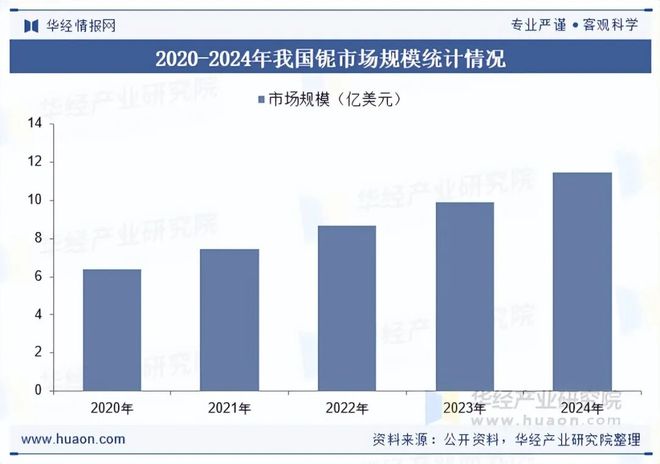 我国铌市场在过去几年变化较快,国内钢铁、航空航天、新能源等下游产业的快速发展,对铌产品的需求不断增加;同时,全球铌市场供需格局的变化,以及我国铌企业在资源开采、冶炼加工技术方面的不断进步,相关政策的支持,为铌行业提供了良好的发展环境,促使我国了铌行业规模在近年来实现了快速增长。据统计2024年我国铌市场规模达到了11.48亿美元,2020-2024年CAGR约为15.68%。