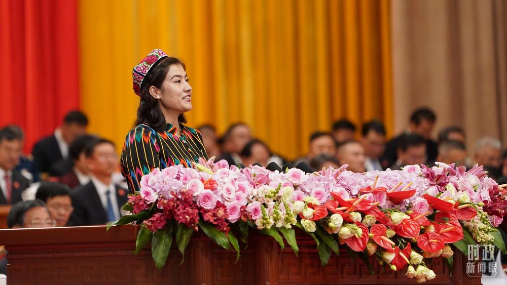 喀什地区巴楚县童梦幼儿园园长艾米拉古丽·阿不都作为尔族群众代表发言。她曾见证了自己所在的幼儿园由低矮的土坯房变成标准化幼儿园,成为乡村最漂亮的建筑。